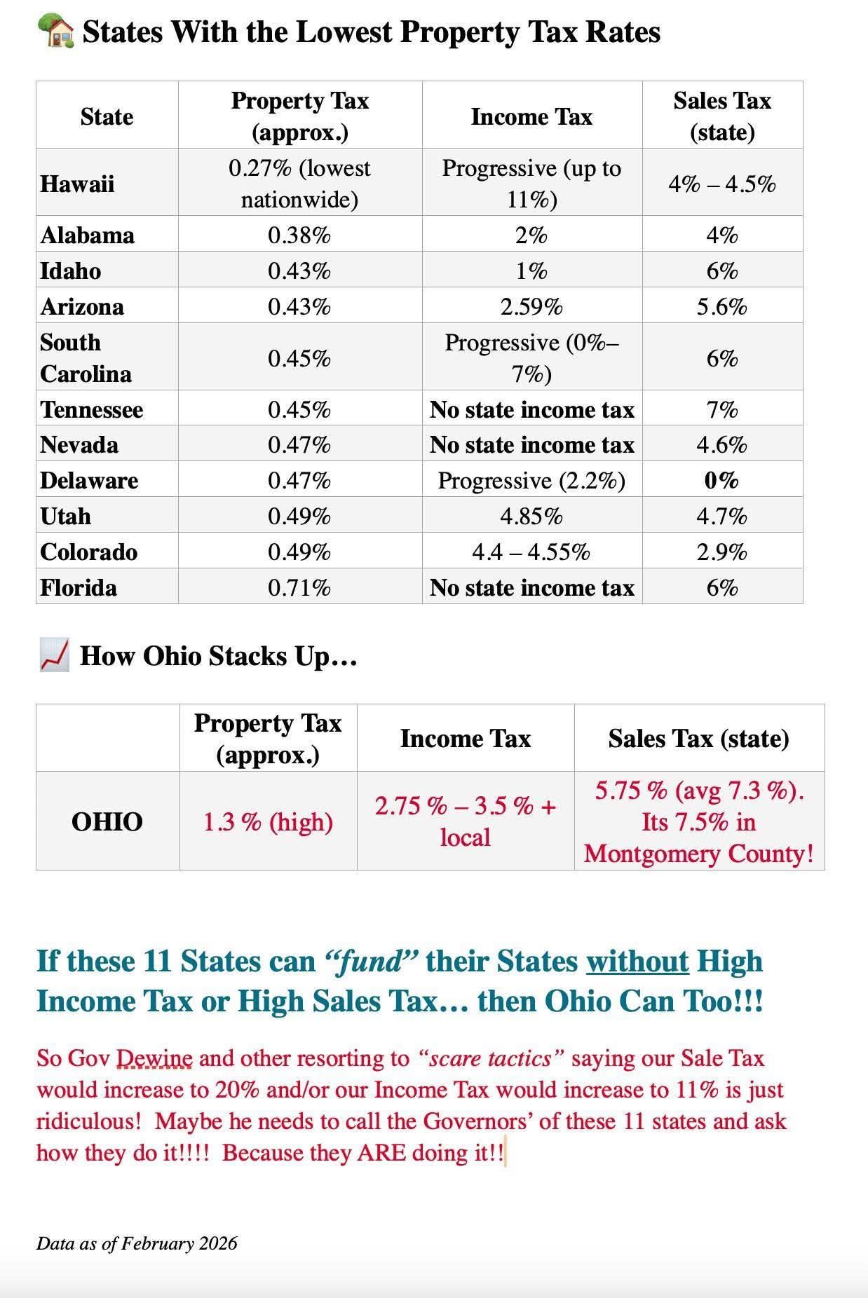 I appreciate the comparison, but tax systems vary widely from state to state and the numbers don’t always reflect how services are actually funded. Many of the states listed rely more on tourism, energy revenue, or different school-funding models, while Ohio depends more on local property taxes to support schools and communities. It’s a worthwhile discussion, but the full context behind each state’s economy and funding structure really matters when making comparisons.